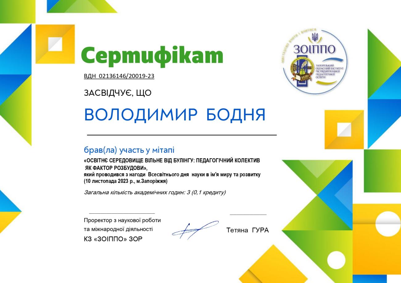 Сертифікат: «Освітнє середовище вільне від булінгу: педагогічний колектив як фактор розбудови» - 3 год/0.1 ЄКТС