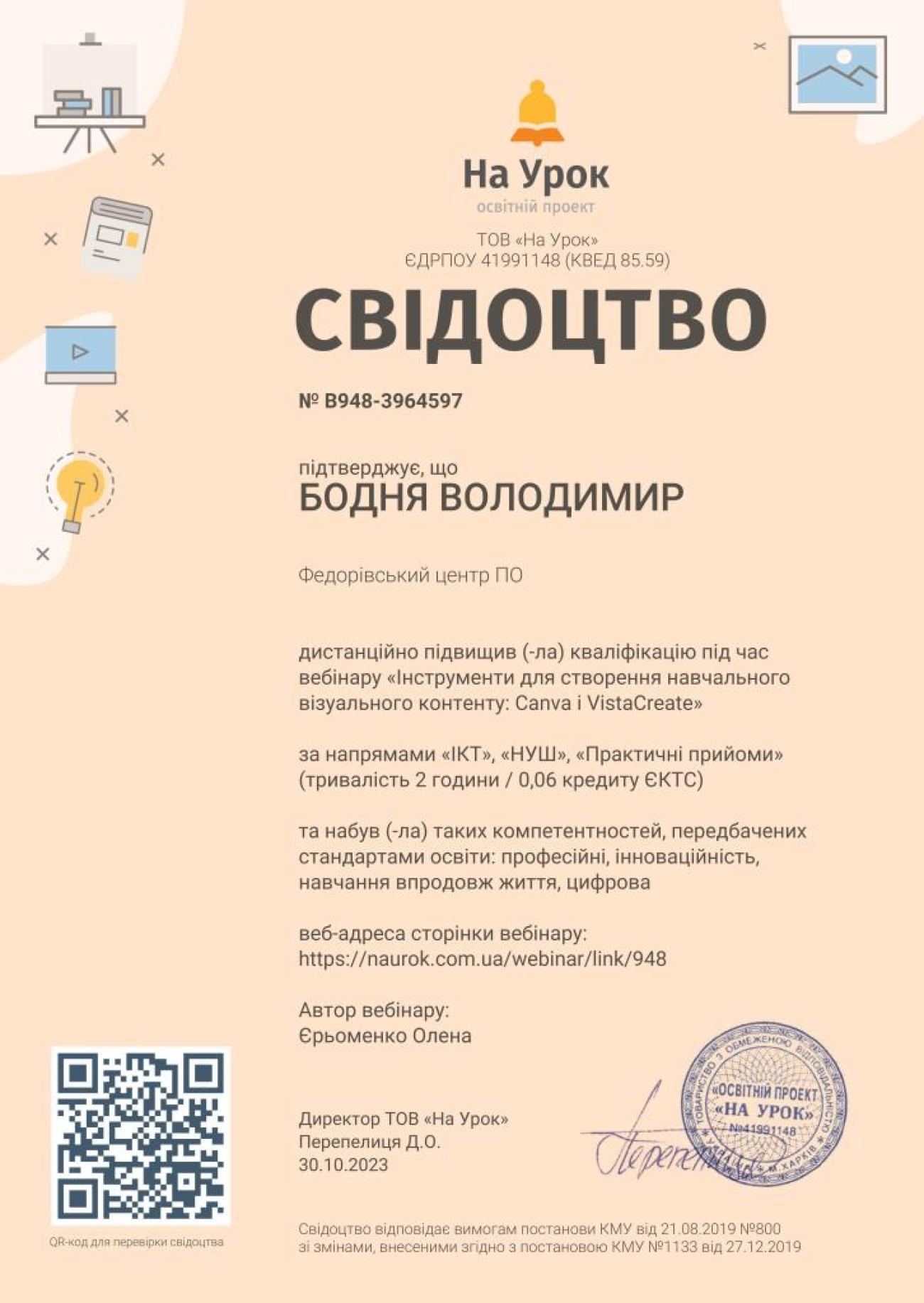 Свідоцтво про підвищення кваліфікації: «Інструменти для створення навчального візуального контенту: Canva i VistaCreate» - 2 год/0.06 ЄКТС
