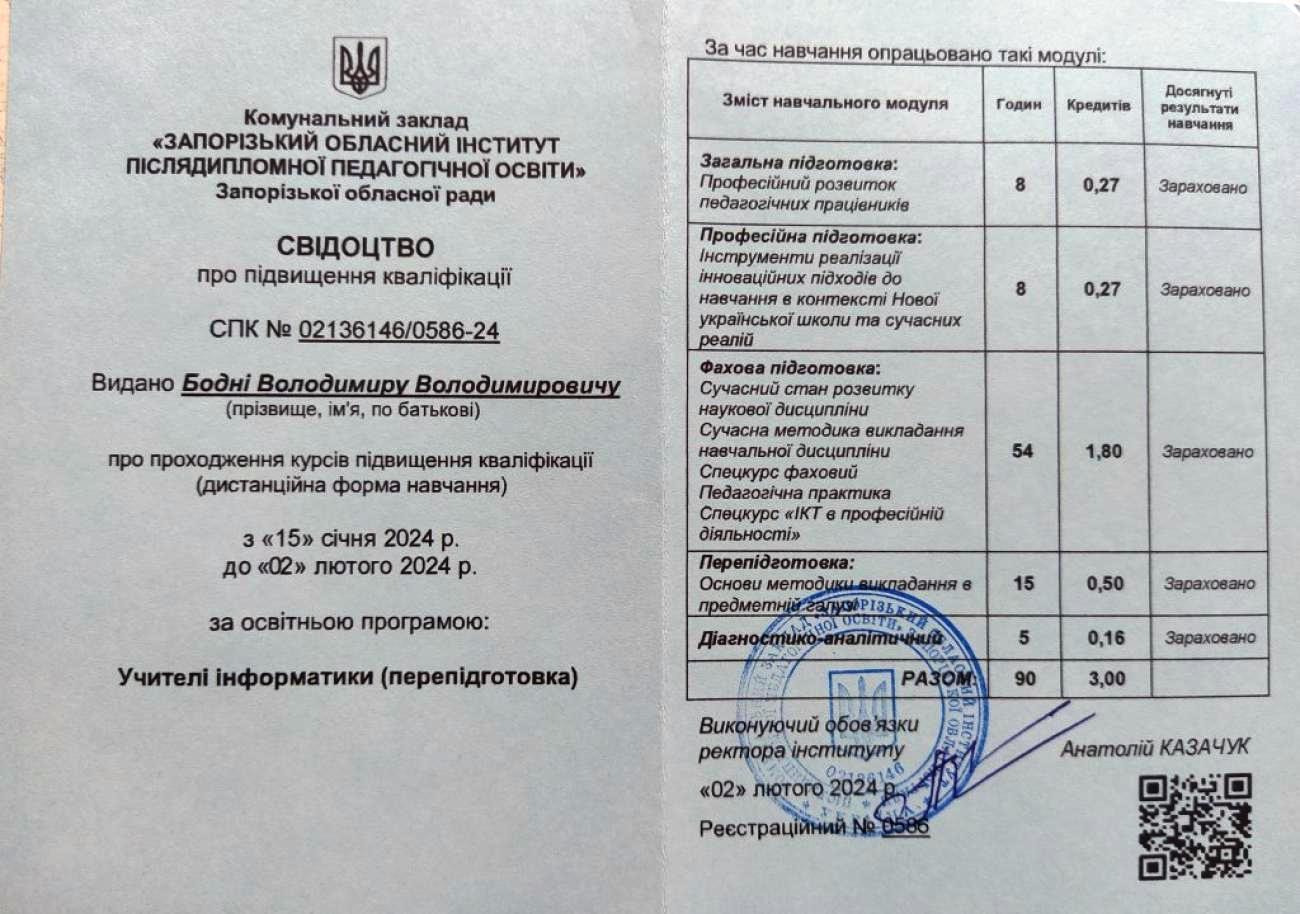 Свідоцтво про підвищення кваліфікації: «Учителі інформатики (перепідготовка)» - 90 год/3 ЄКТС