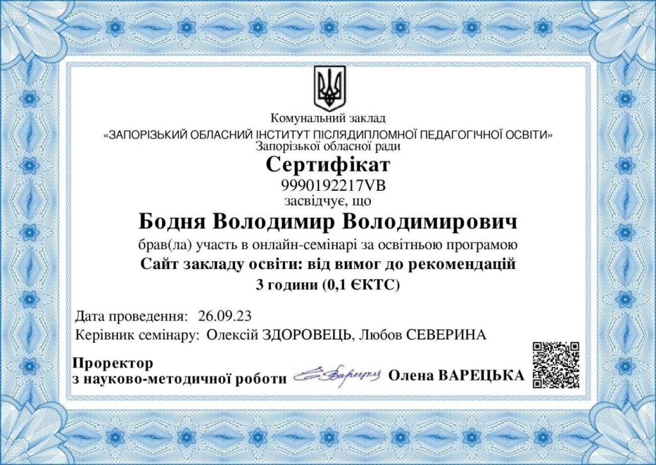 Сертифікат: «Сайт закладу освіти: від вимог до рекомендацій» - 3 год/0.1 ЄКТС