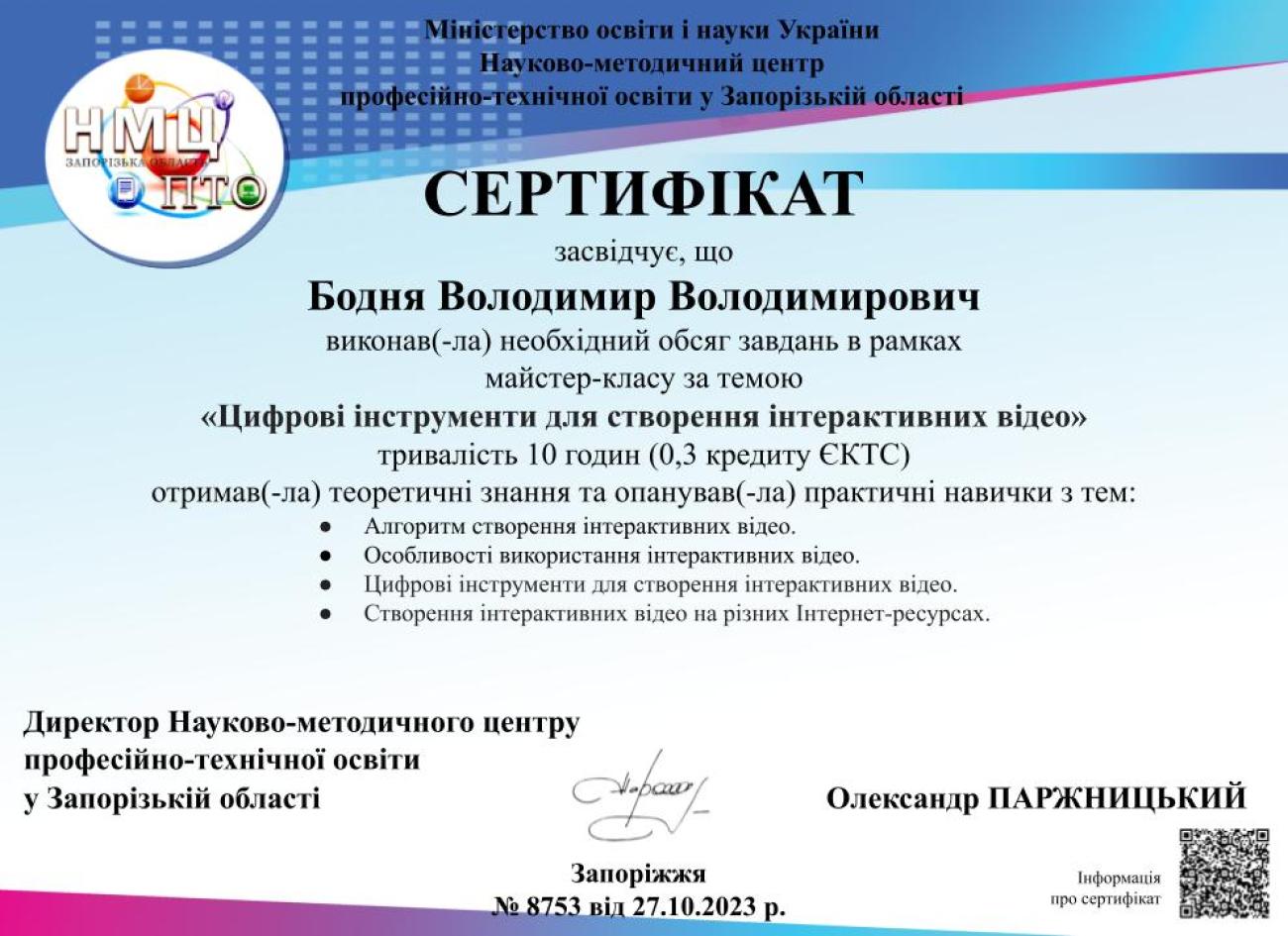 Сертифікат: «Цифрові інструменти для створення інтерактивних відео» - 10 год/0.3 ЄКТС