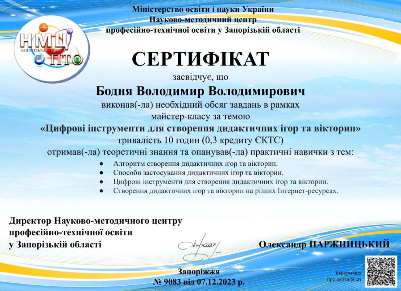 Свідоцтво: «Цифрові інструменти для створення дидактичних ігор та вікторин» - 10 год/0.3 ЄКТС